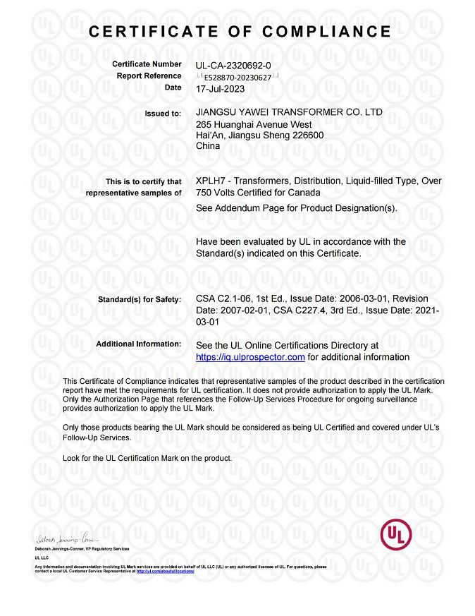 YaWei pad mounted transformer have been evaluated by UL in accordance with the U.S and Canada Standard(s). Our transformer certified by UL based on Canadian standards (CSA standards) .
